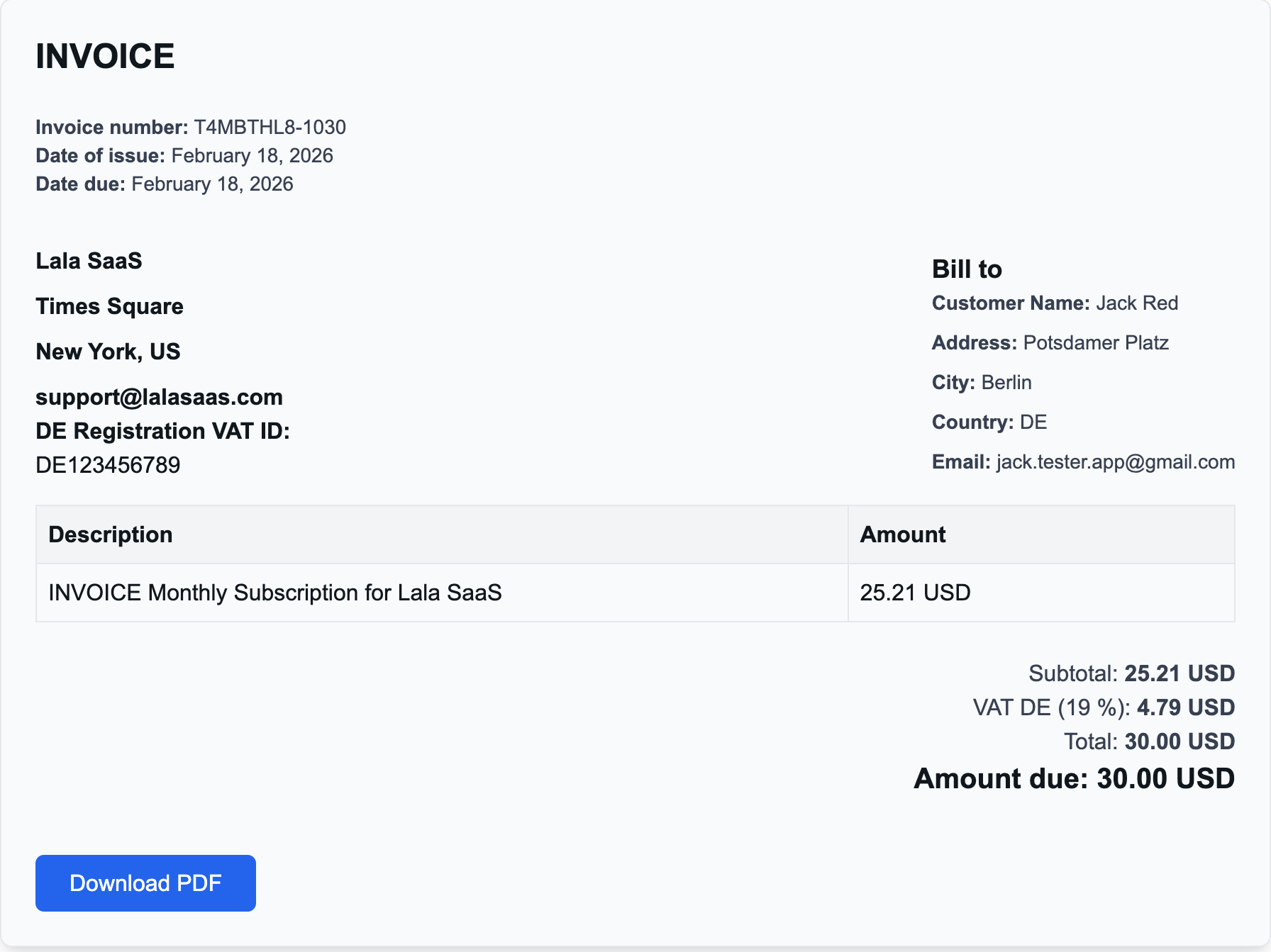 Customers enter their email address and instantly receive a magic link where they can view and download an invoice generated for their jurisdiction.